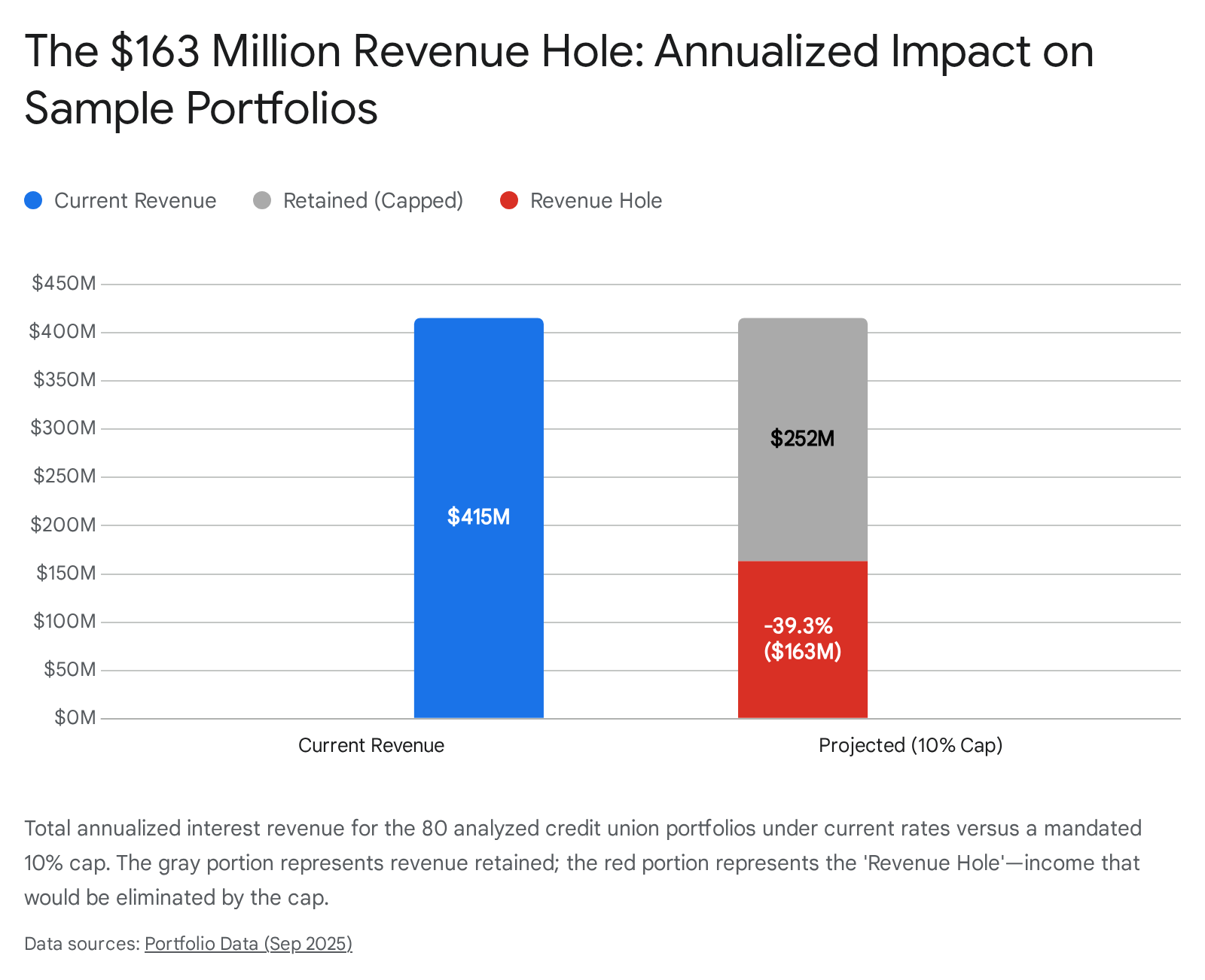 The chart above starkly visualizes the "Revenue Hole." The red segment represents capital that is currently circulating within the credit union ecosystem—funding rewards, covering fraud losses, and building capital reserves—that would vanish under the proposed legislation.