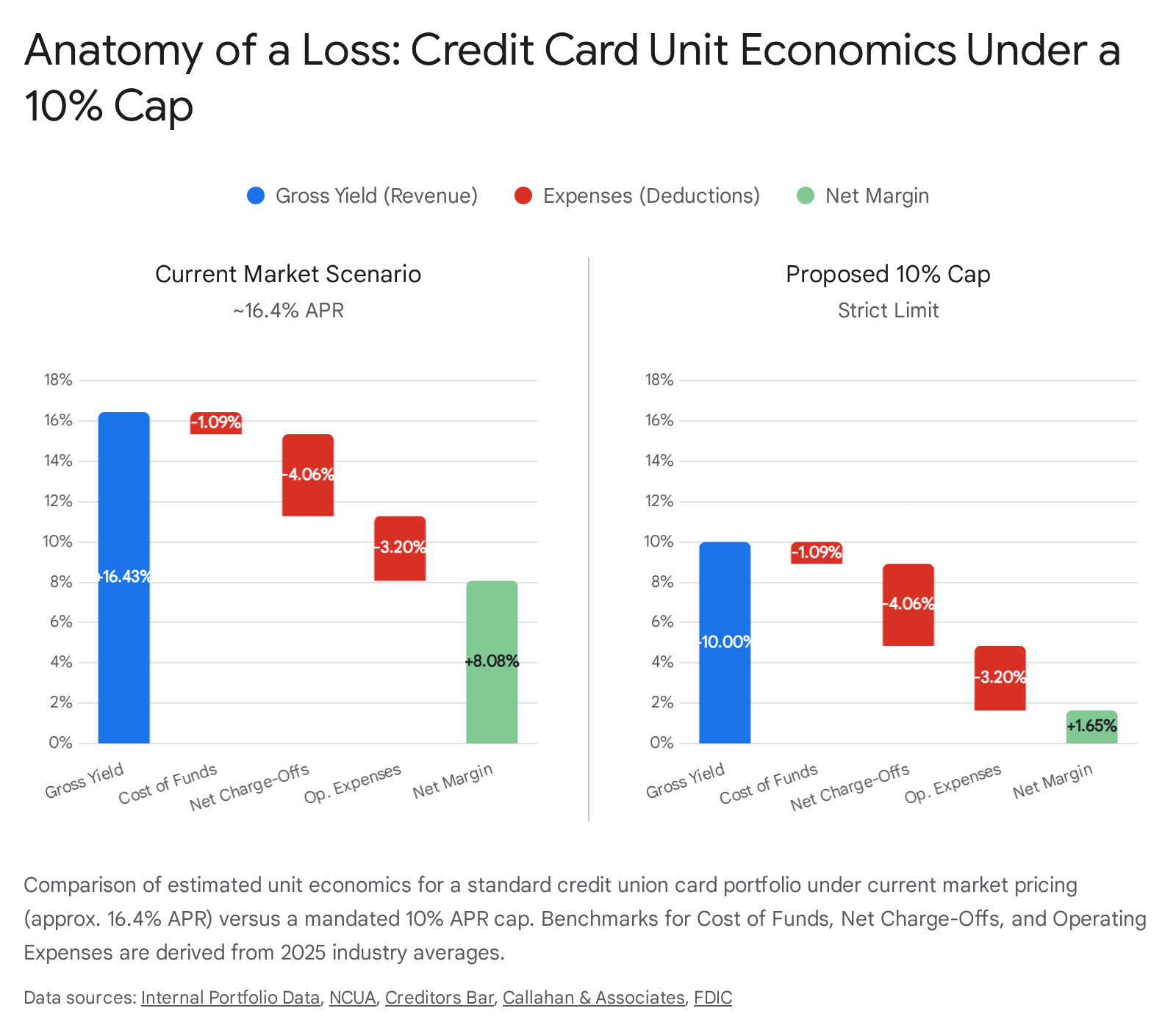 The credit card product is unique in retail banking. Unlike mortgage or auto lending, which are collateralized and amortizing, credit card lending is unsecured, revolving, and operationally intensive. It relies on a delicate equilibrium between interest income from revolving balances (the "borrowers") and interchange income from transaction volume (the "transactors"). A 10% price ceiling disrupts this equilibrium fundamentally. As this report will demonstrate, for many credit unions, the cost of delivering the product—comprising the cost of funds, net charge-offs, fraud losses, and servicing expenses—exceeds the 10% revenue ceiling, rendering the product structurally unprofitable for all but the most pristine credit risks.