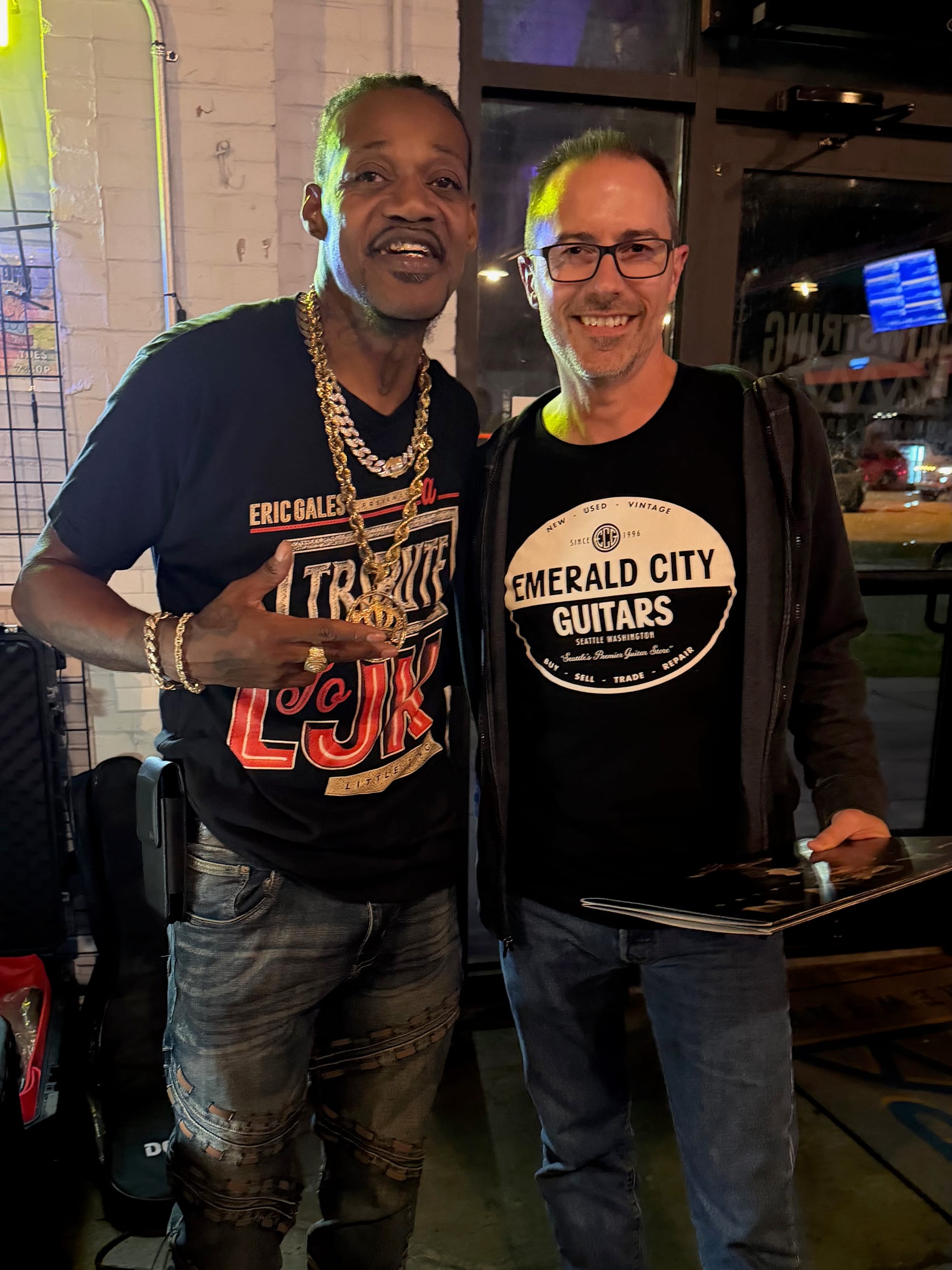 I caught up with Eric after the show (that’s us in the photo below). During the performance, he said something that struck me. He described the feeling of playing a specific song as being on a mountaintop—or rather, that the music needed to be heard from a mountaintop.